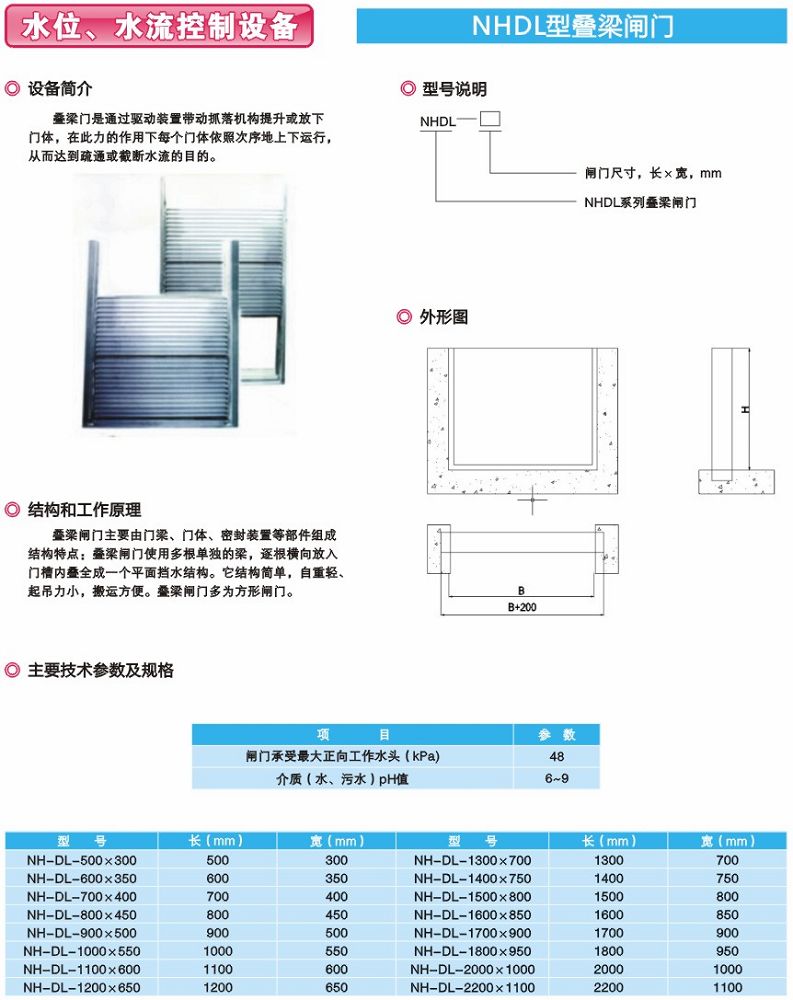 產品特點:疊梁閥安裝于渠道中,利用人工將疊梁逐快放入渠道中,具有